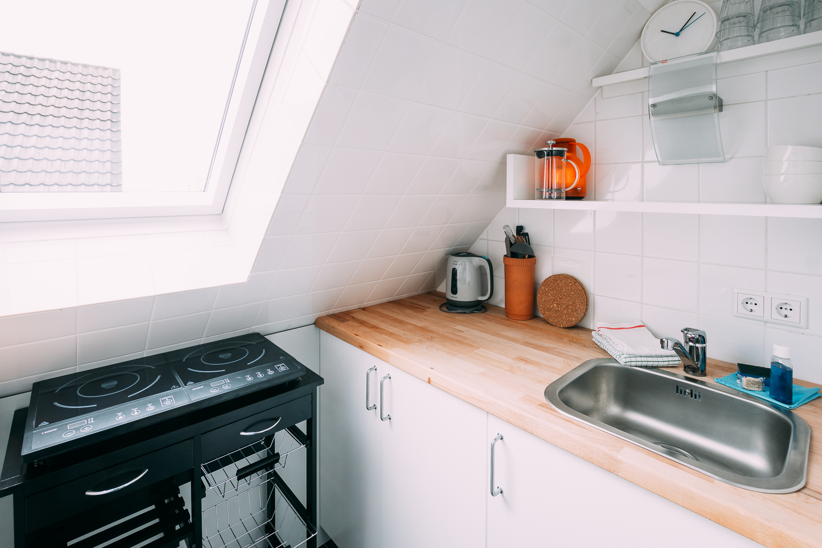 Eine kleine, voll ausgestattete Küche mit SpüMa, Airfryer, MicroWelle/Grill und allen Utensilien schaffen die Möglichkeit zur Selbsateversorgung.